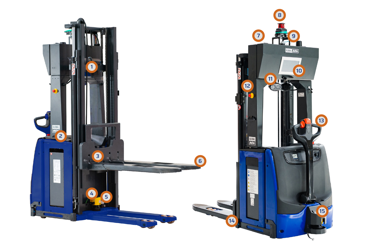 13. Håndtag til manuel betjening - giver mulighed for manuel drift, når der skiftes ruter eller AGVen kortlægges
