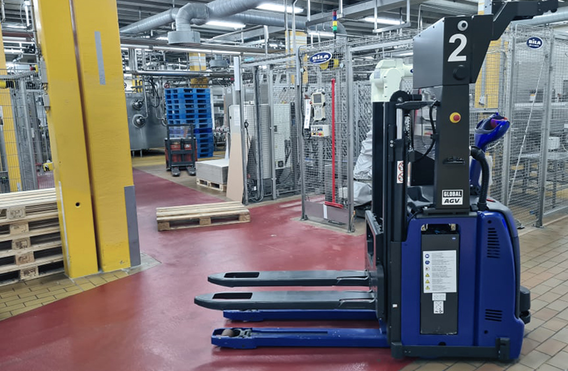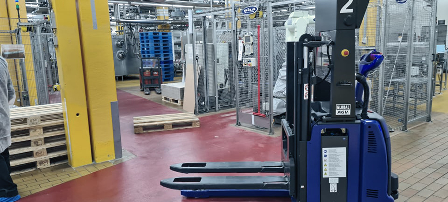 En førerløs truck fra Global AGV hjælper fødevareproducenten Dragsbæk i Thisted med at flytte paller med margarineblokke fra produktionen til lageret. Den selvkørende truck-teknologi mindsker omfanget af manuelle skub og sparer medarbejderne for tunge løft.